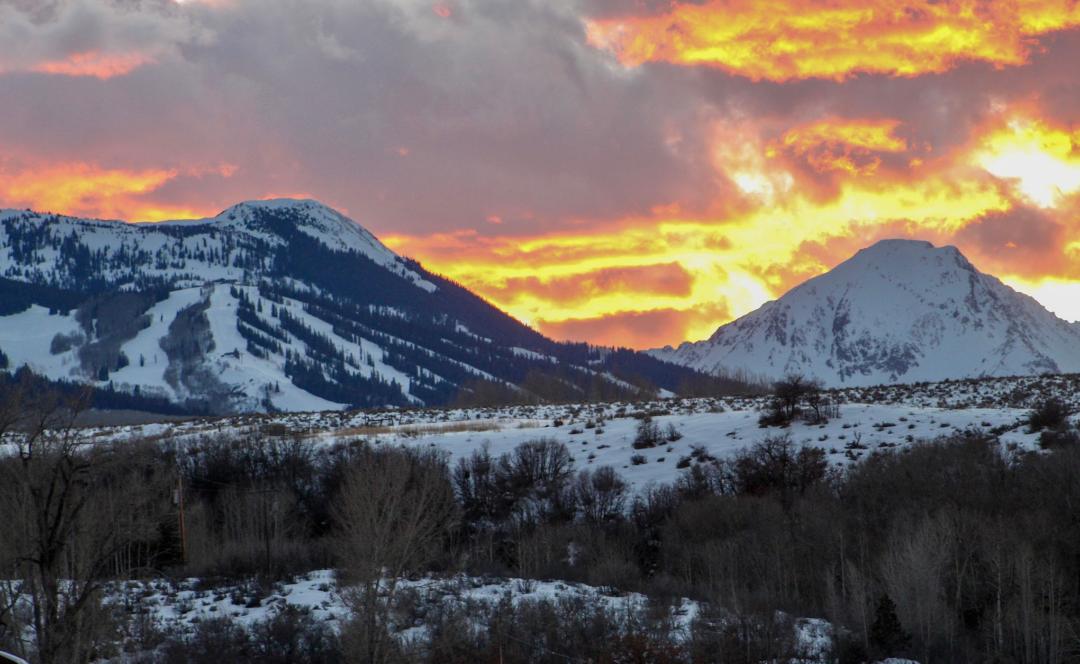 Experience the stunning beauty of nature with Fire in the Sky. As the sun sets, the distant landscape is lit up with fiery hues, creating a breathtaking image of Colorado's beauty.